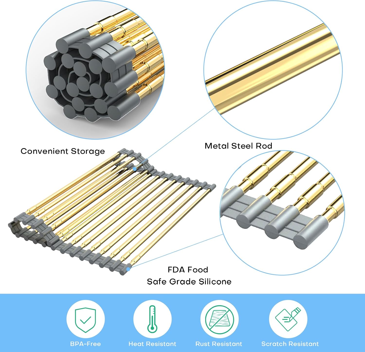 Expandable Large Draining Rack, Roll Up Heat-Resistant Dish Drainer for Stainless Steel Sinks, Collapsible Over The Sink Rack Non-Slip Silicone Rolling Up Rack Gold 18 Tube