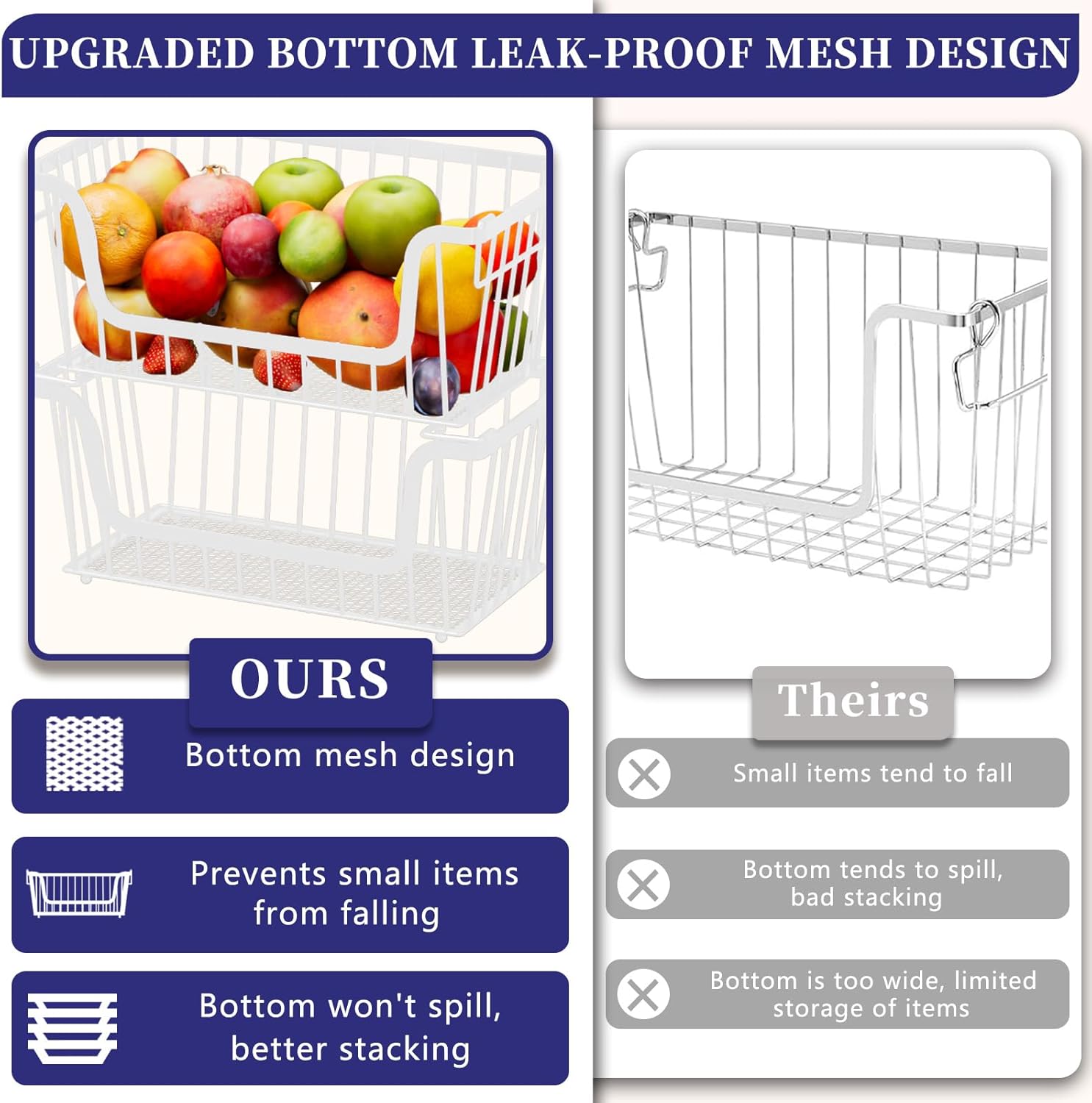 Enhanced Leak-Proof Bottom Stackable Wire Baskets, 6 Pack Pantry Organizers and Storage, pantry storage,Shelf Baskets, Fruit Basket, Potato and Onion Storage Bins,(White)