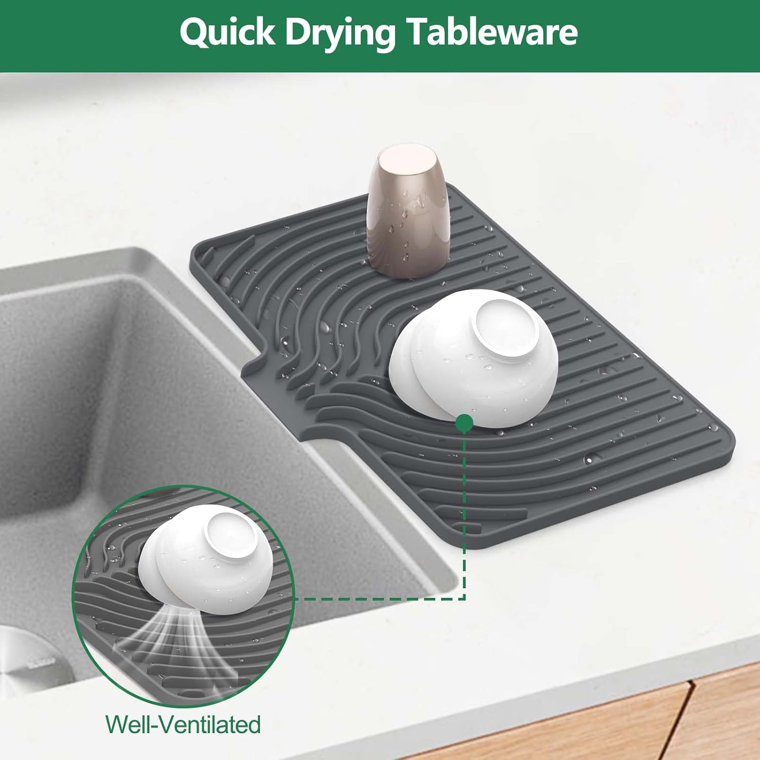 • Food-Grade Silicone Material: The kitchen counter dish drying mats are crafted from high-quality, food-grade silicone. It's durable, soft and resistant to deformation. It offers a safe surface for drying dishes, fruits and veggies, guaranteeing a cleaner and more hygienic kitchen area