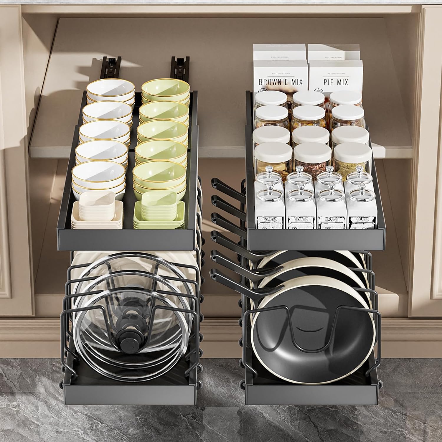 - Stable & Durable —— This pots and pans organizer under cabinet is made of thickened steel and silent sliding rails, with strong load-bearing capacity, smooth and stable pulling, and long-lasting durability