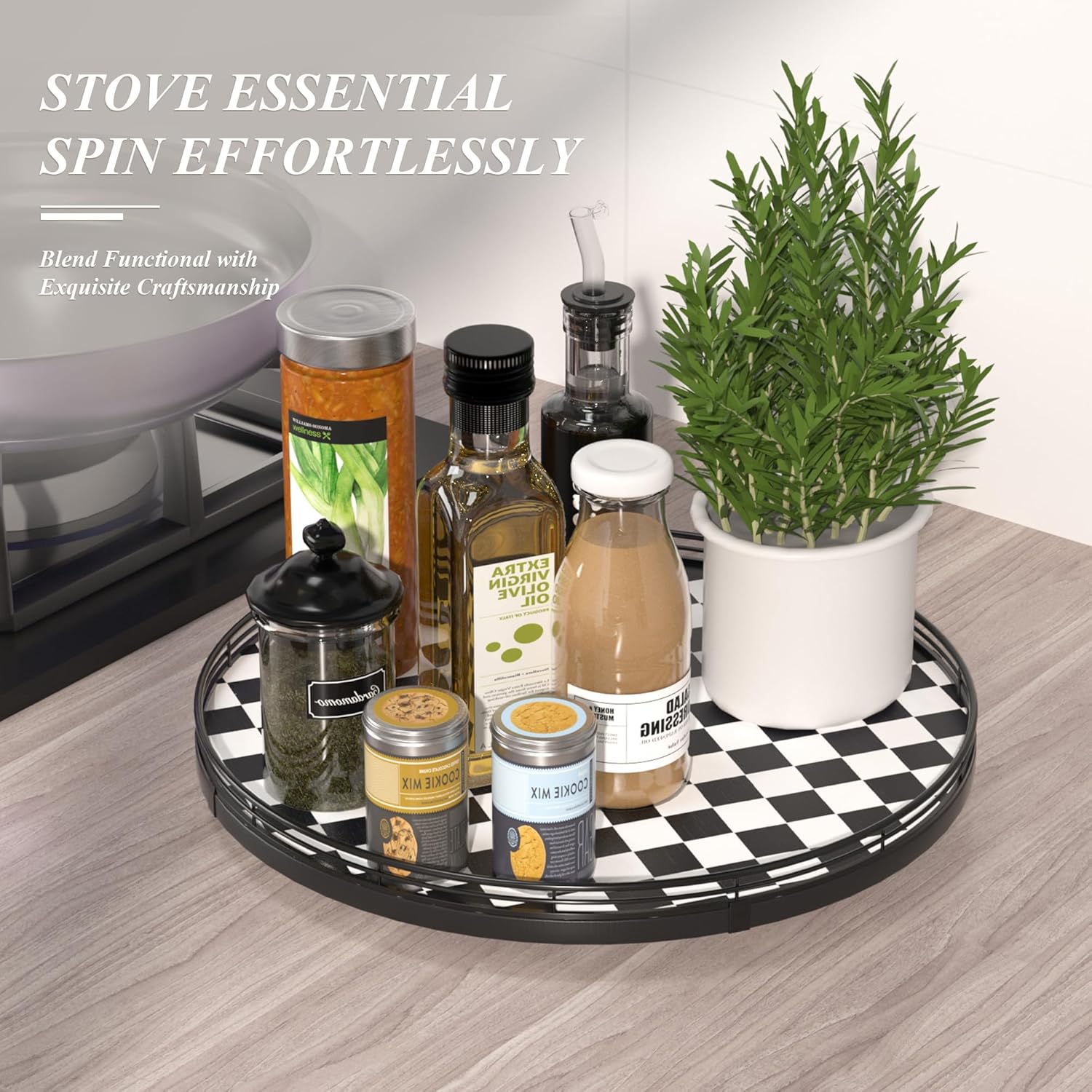 - CLASSIC BLACK AND WHITE CHECKERED DESIGN: A stylish black and white kitchen decoration plate with a sturdy iron frame, seamlessly blending with your black and white kitchen things to elevate your home decor. Perfect as a large decorative lazy Susan, a kitchen table centerpiece, or a table kitchen caddy, bringing both function and charm to your tabletop.