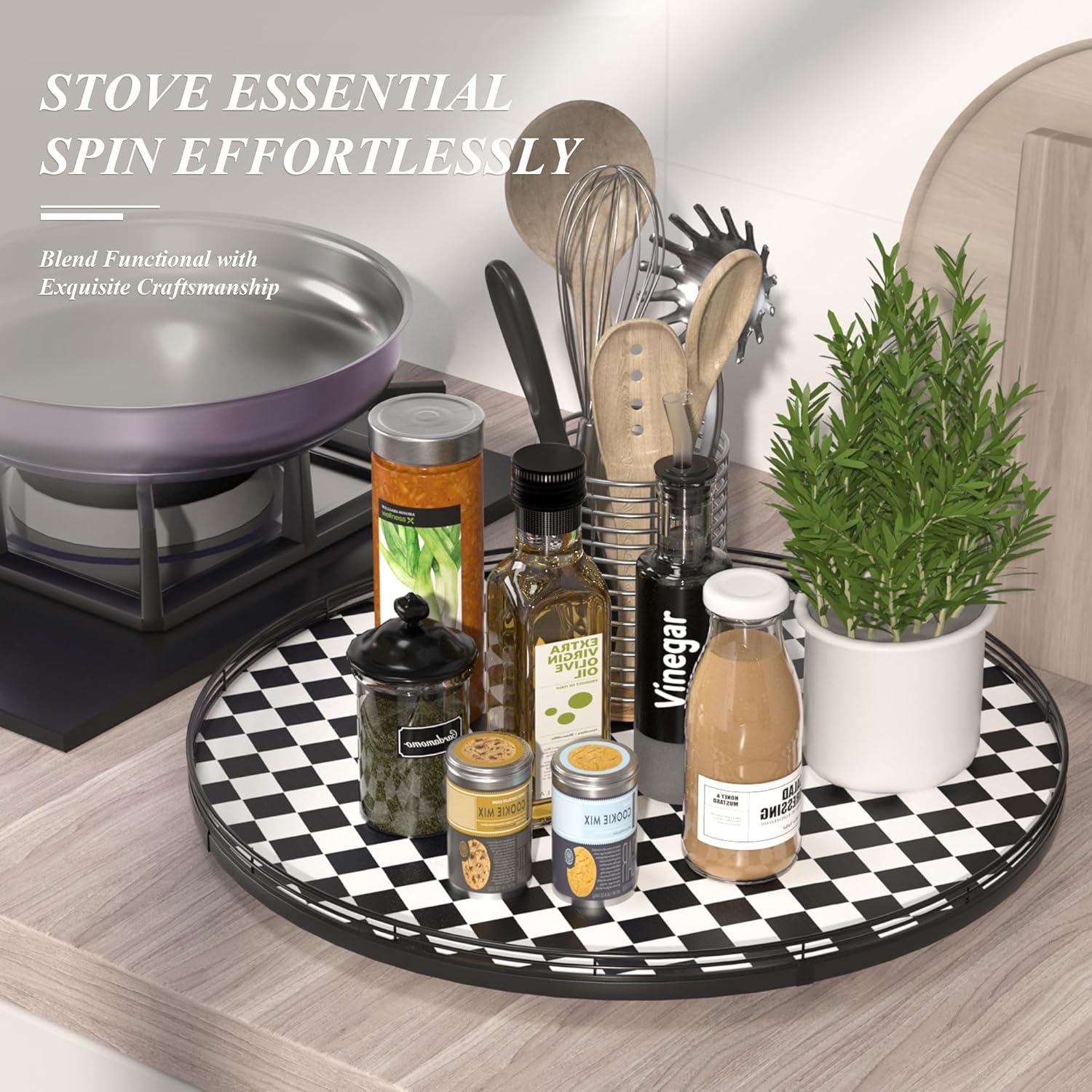 - CLASSIC BLACK AND WHITE CHECKERED DESIGN: A stylish black and white kitchen decoration plate with a sturdy iron frame, seamlessly blending with your black and white kitchen things to elevate your home decor. Perfect as a large decorative lazy Susan, a kitchen table centerpiece, or a table kitchen caddy, bringing both function and charm to your tabletop.
