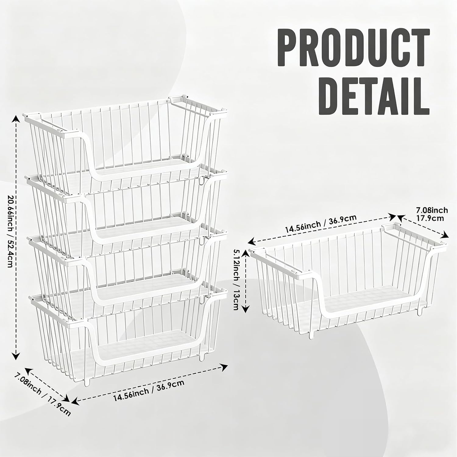 - (LARGE CAPACITY HOLLOW BASKET):Each basket measures 14.57"L * 7.09"W *5.12"H.When stacked, the combined dimensions of 4 baskets are 14.57"L * 7.09"W *20.67"H.The hollow metal basket allows air circulation,keeping fruits and vegetables fresh and tasty with a longer shelf life. It features a U-shaped design for easy access to items and raised openings to prevent items from falling.Perfectly designed for pantry organizers and storage.Stackable”, ‘Breathable Mesh’, ‘Vertical Space’, ‘Modern Simplicity’, etc., space management specialists tailored for modern life.
