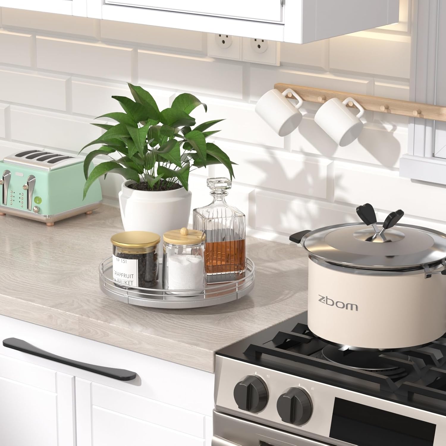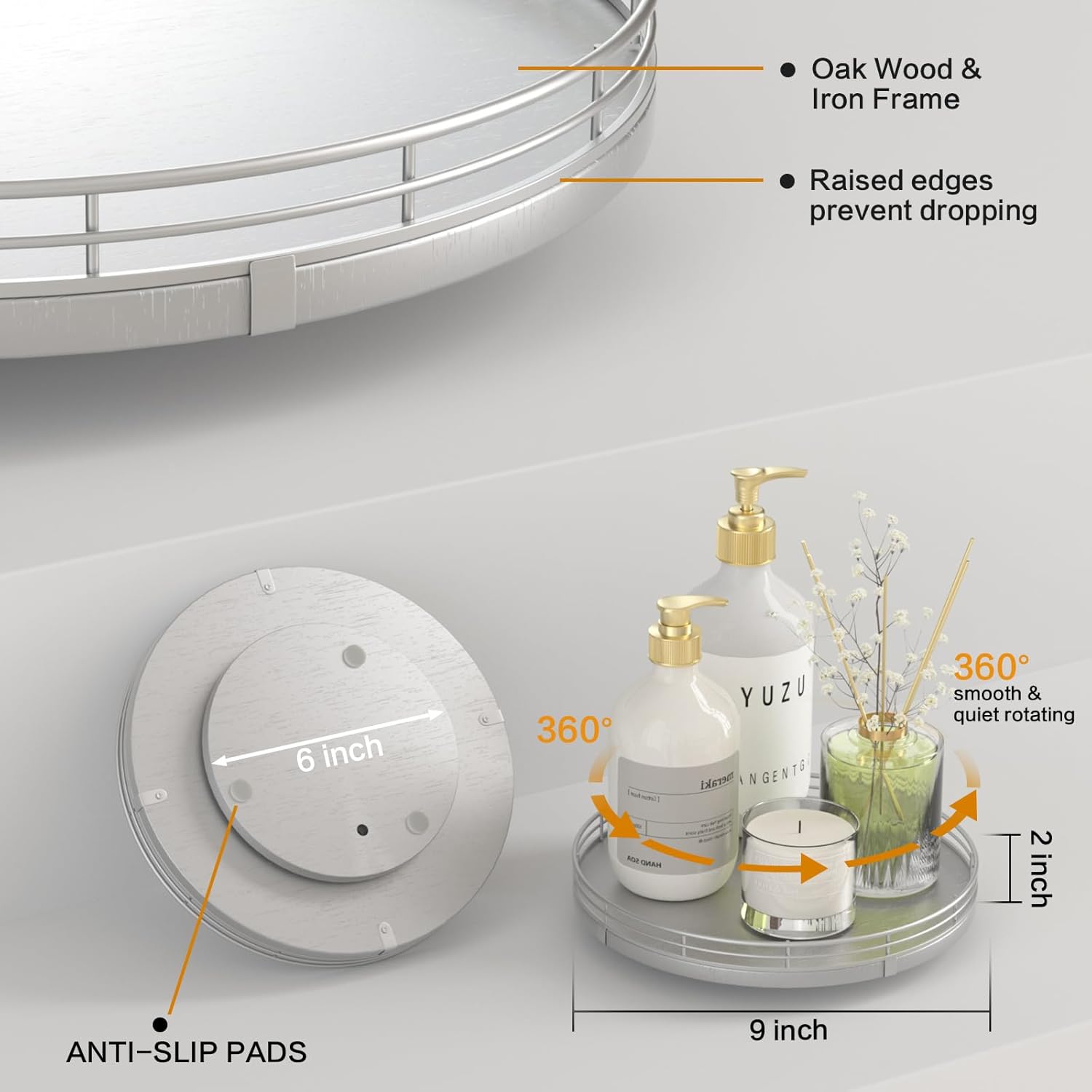- Thoughtful Design: The turntable silver tray features a smooth and silent 360°rotation; Bottom slip-resistant pads for stability and protect your countertop from scratches; Raised edges on each organizer tray to keep items from falling out; Easy to use, no installation required