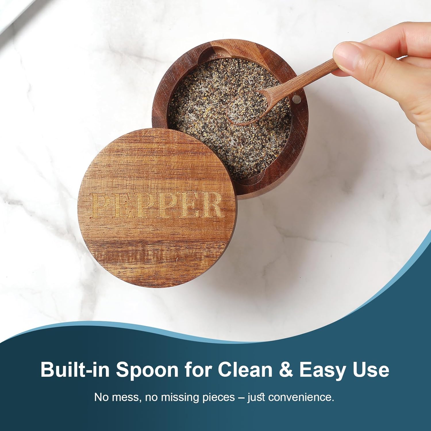 PEPPER Cellar, Acacia Wood Salt Container with Built-in Spoon & Swivel Lid, Engraved PEPPER Box, Salt Holder Bowl for Countertop Seasoning Storage