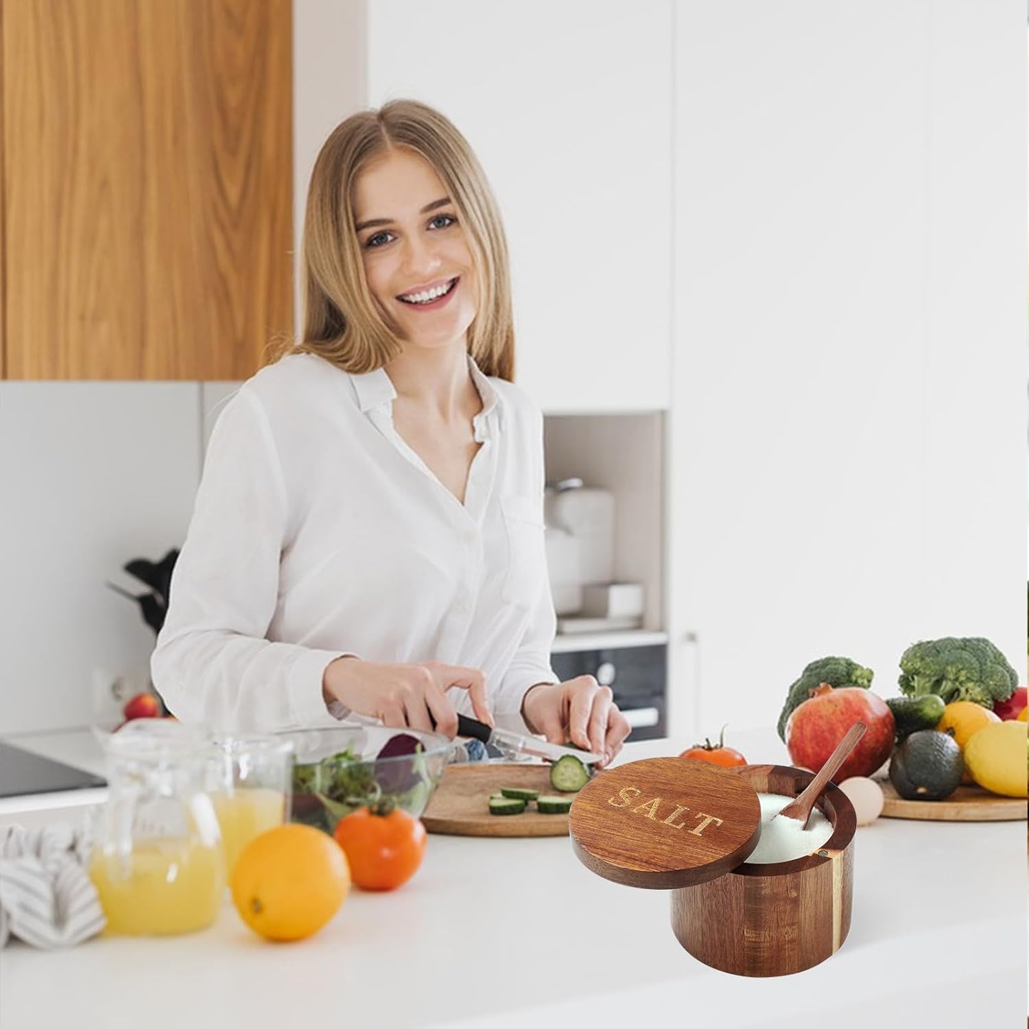 - One-Handed 360° Swivel Lid – This salt container with lid and spoon features a smooth swivel top for quick, one-handed access. Keep seasonings fresh and within reach while cooking, making it a must-have salt dish and salt jar for everyday use.