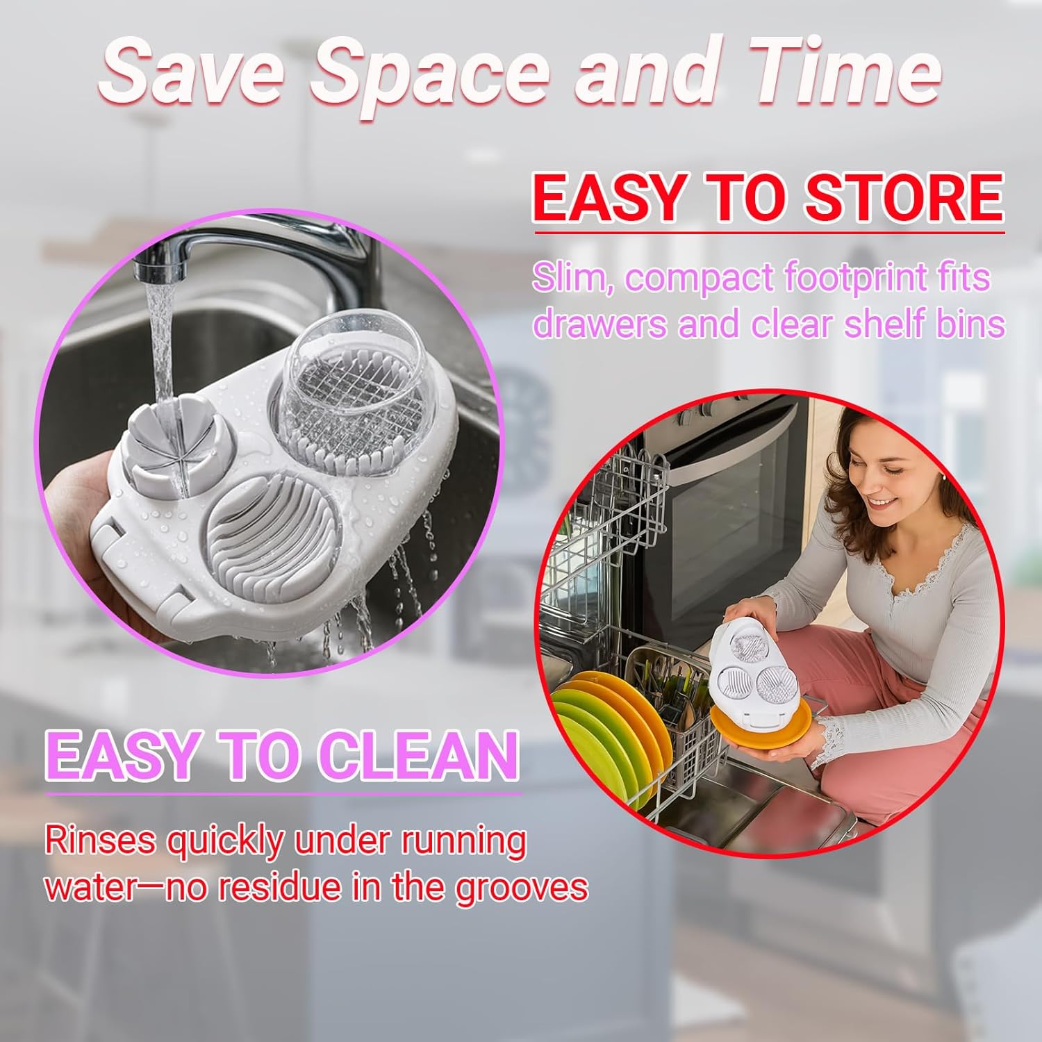 - ăEasy to clean and storeă Smooth surfaces rinse quickly under water or go in the dishwasher, and the compact footprint fits standard kitchen drawers, keeping this 3 in one egg slicer ready for everyday cooking and snack making