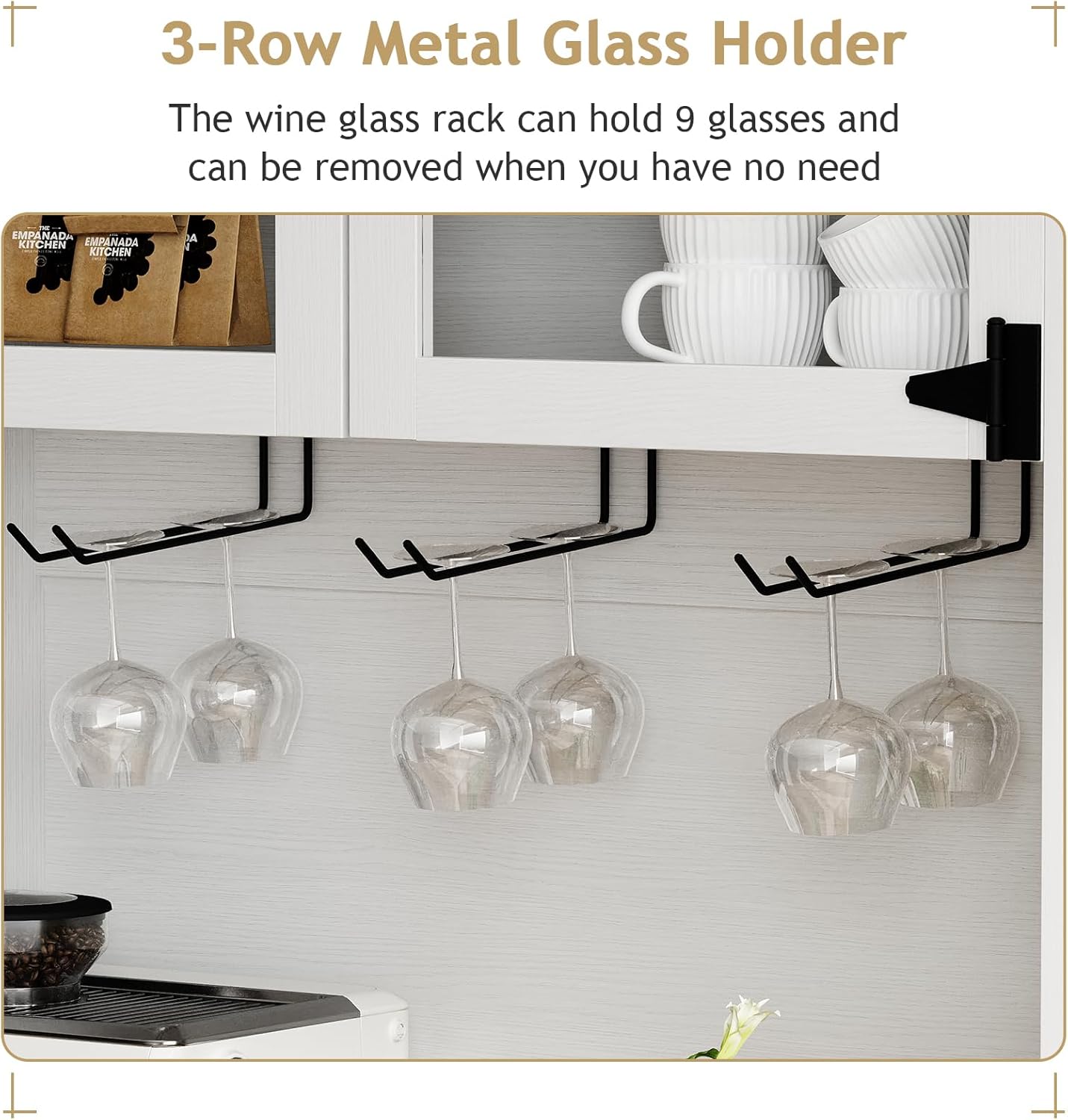 - Storage and Practicality:The coffee bar features multiple metal hooks for hanging mugs and towels. Coffee bar's spacious interior includes deep shelves that easily accommodate glassware and bar essentials