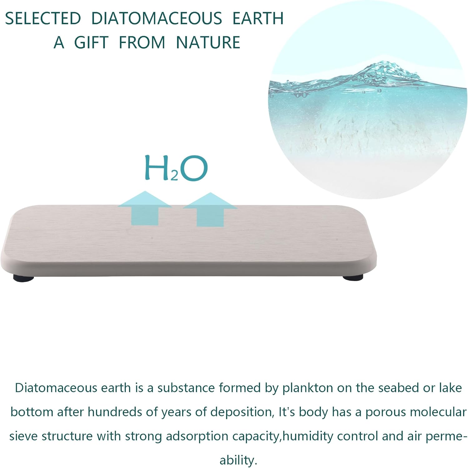 - Made from natural Diatom mud and plant fiber, small holes within diatomite enable it have amazing water absorption. They could absorb water and gets dry in a few minutes. It makes the Bathroom Counter top more dry and tidy.
