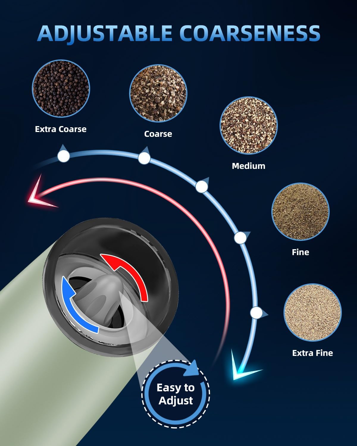 - 【ADJUSTABLE COARSENSESS】 Our electric salt or pepper grinder set just rotate clockwise to grind into fine grains and counterclockwise to grind into coarse grains. You can easily adjust the coarseness of spices according to your preference.