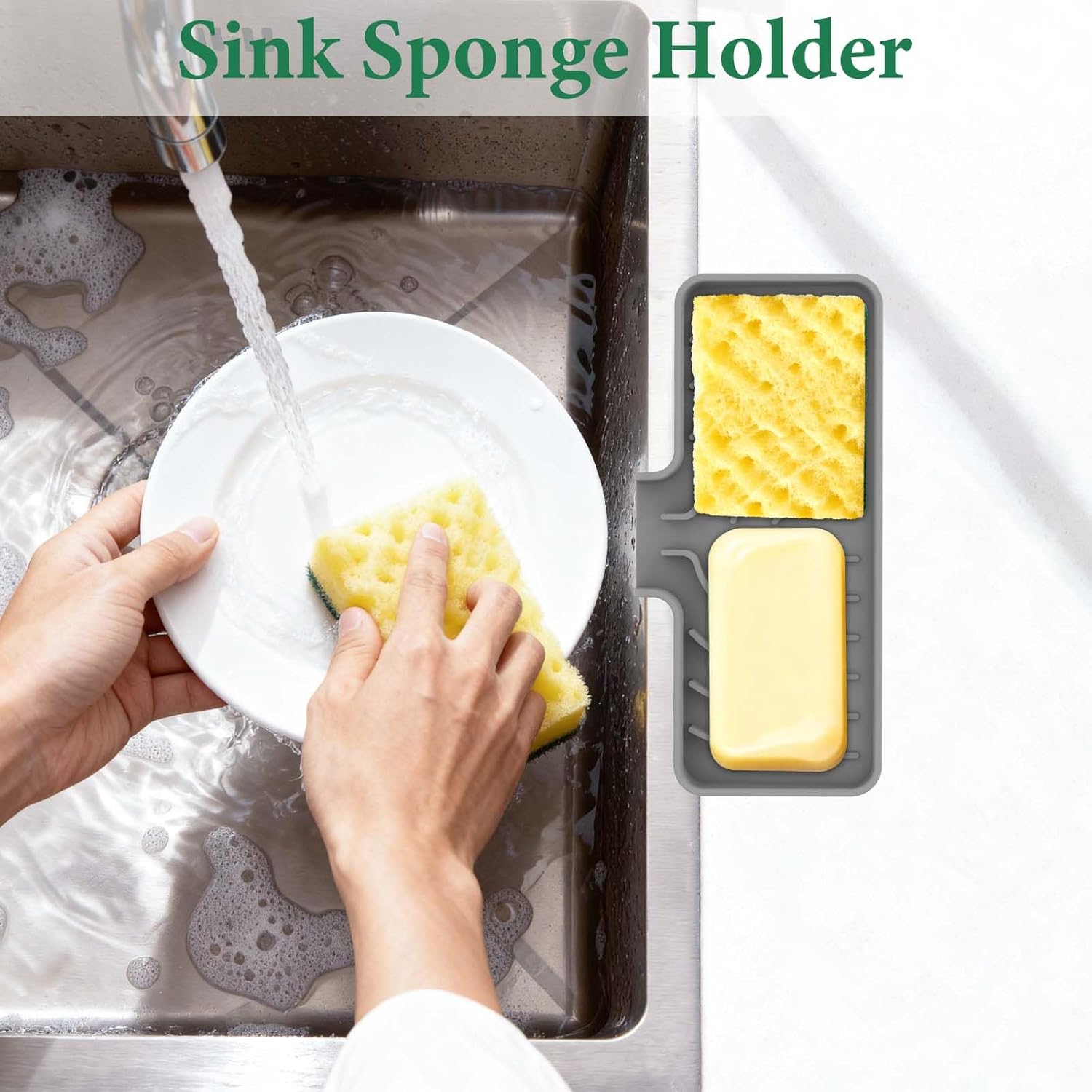 GUUKIN Silicone Sponge Holder, 9.8"×4.9" Sponge Holder for Kitchen Sink, Soap Tray with Drain, Dish Soap Mat for Shower Bathroom(Grey)