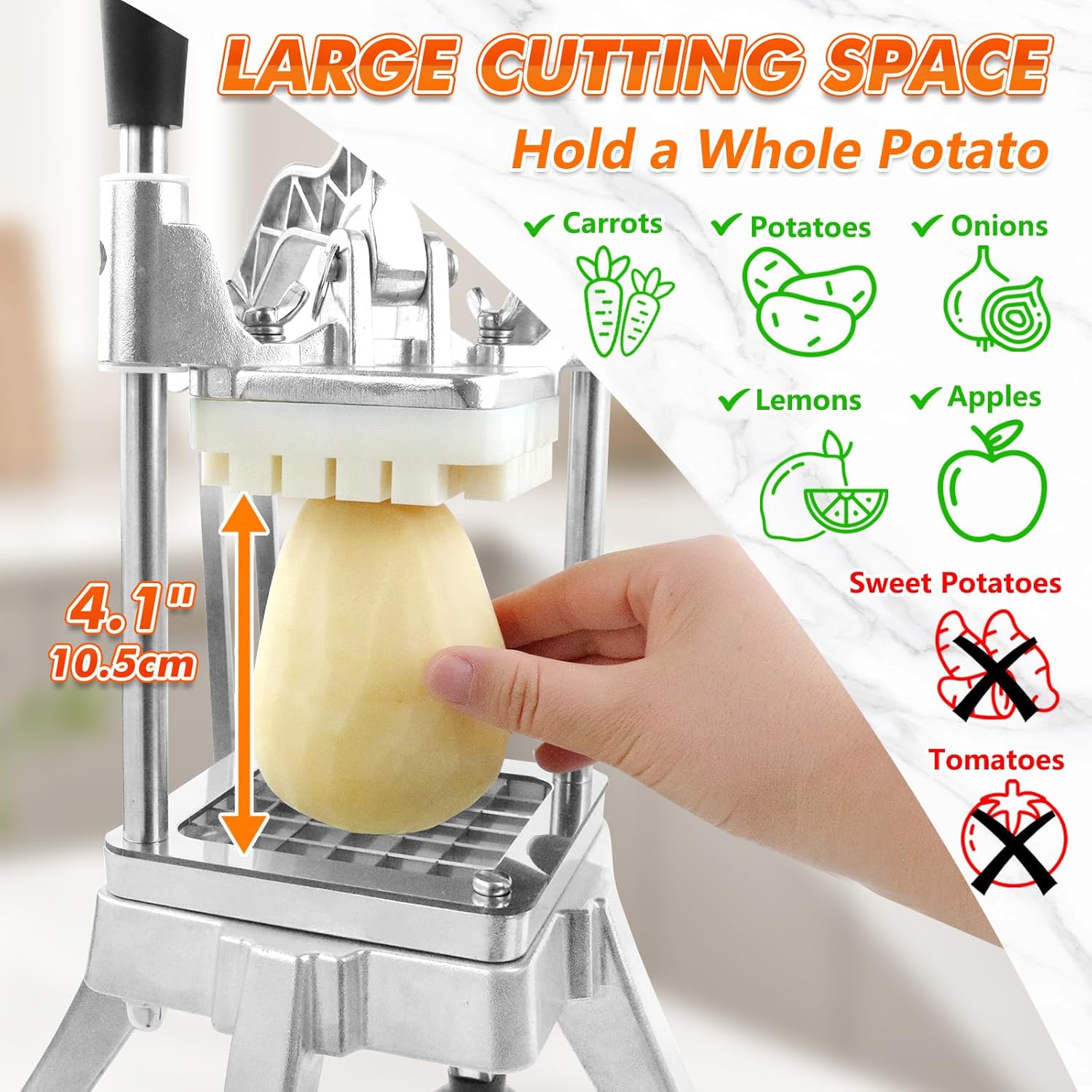 - Large Cutting Box: With a 4" cutting box, this french fry cutter is big enough to handle a whole potato, onion, lemon, and more; a reliable helper for home kitchens, restaurants, bars, pizzerias, food trucks, and parties, also makes a great gift choice