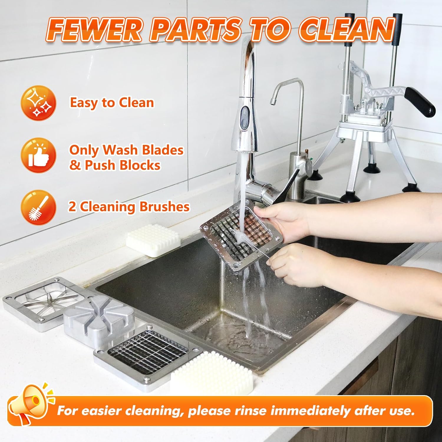 - 4 Stainless Steel Blades: 1/4", 3/8", 1/2" and 8-wedges blades meet your diverse needs, allowing you to create french fries or potato cubes in various sizes, or slice apples and lemons into 8 wedges with ease