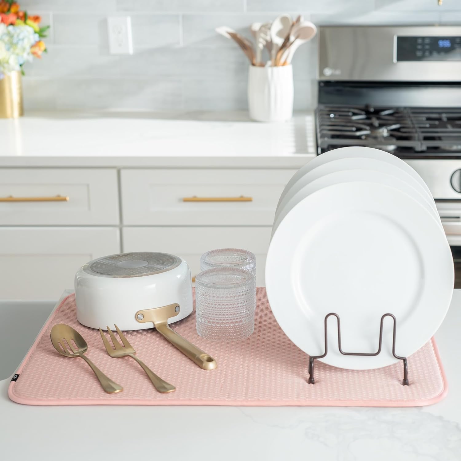 - Catch the kitchen sink drips under a dish drying rack or place your plates, forks, spoons, pots and pans set, or glassware directly on the drying mat